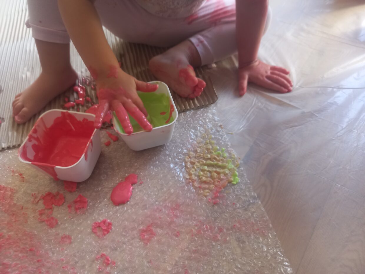 O veículo de expressão será tinta à base de iogurte, pelo que é importante que as roupas sejam passíveis de se sujar (sugerimos muda para troca no final); os pés também podem entrar na exploração, caso os pais se sintam confortáveis para tal, e neste caso é importante ter atenção à roupa que irão sujar (não trazer collants, por exemplo).